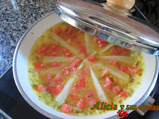 Calentamos el aceite y pochamos en él el puerro picado menudo con un poco de sal.